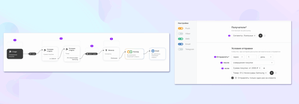 Цепочки рассылок с разделением по условиям и каналам. Скриншот с платформы лояльности MAXMA.com