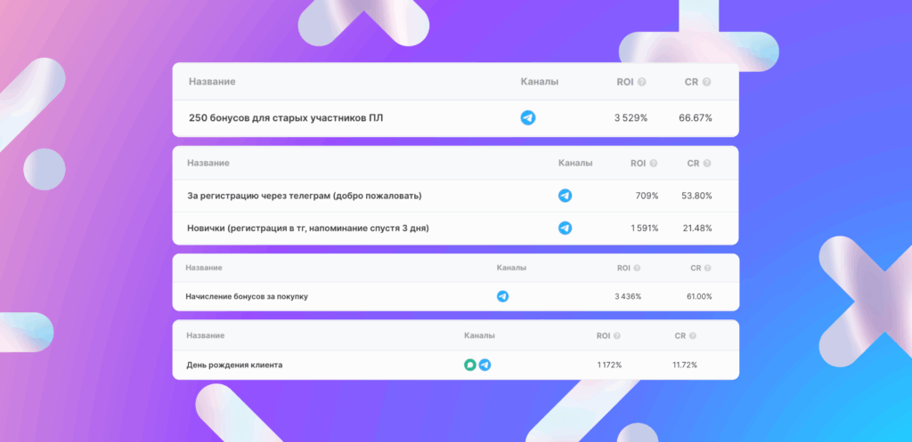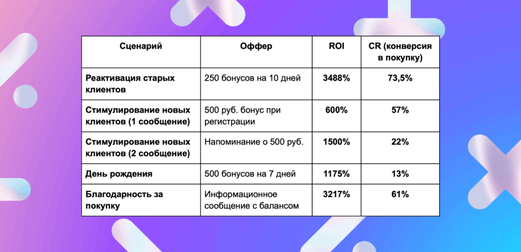 Реактивация старых клиентов: 250 бонусных баллов на 10 дней для тех, кто давно не покупал, ROI: 3488%.