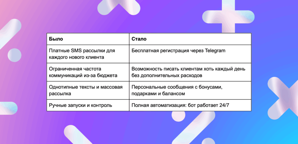Программа лояльности работала, но дорого: каждое SMS — прямые расходы, а альтернативного «бесплатного» канала не было. При этом бизнесу важно было оставаться на связи с аудиторией: информировать об акциях, напоминать о бонусах, возвращать клиентов.