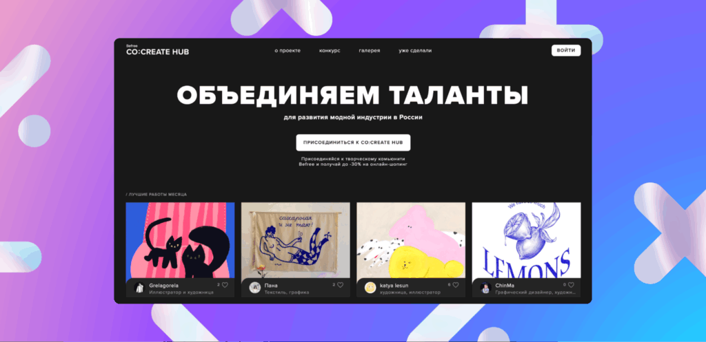 Befree развивает платформу Co:Create HUB для молодых художников и дизайнеров. Пользователи могут загружать портфолио, участвовать в конкурсах и получать шанс на коллаборацию с брендом. Пилотным проектом стал конкурс принтов, посвященных городской идентичности. Работы победителей были запущены в производство и появились в розничных магазинах. Авторы получили гонорары и публичность. Вокруг платформы сформировалось сообщество креаторов, лояльных бренду.