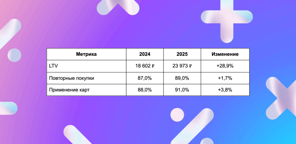- Высокий процент применения карт — более 90% чеков проходят через ПЛ.
