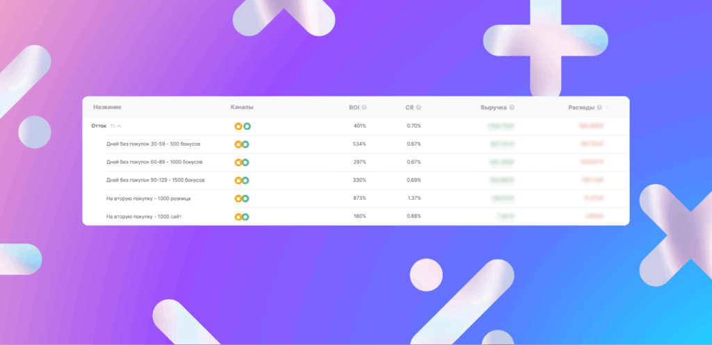 - сегментировать аудиторию по поведению, покупкам и реакции на коммуникации;
