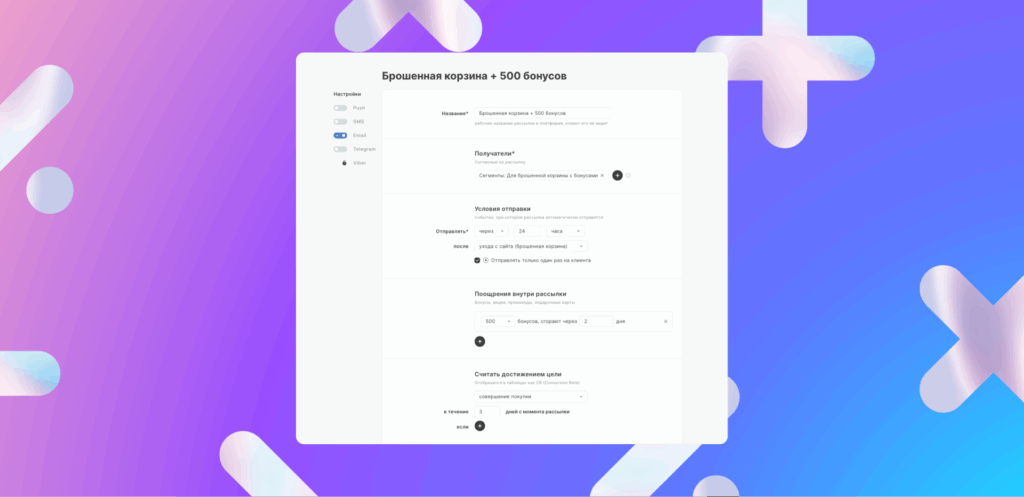 Настройка рассылки по триггеру «брошенная корзина». Скриншот с платформы лояльности MAXMA.com.