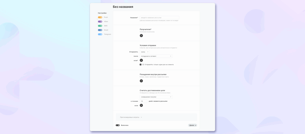 Настройка рассылки. Скриншот с платформы лояльности MAXMA.com.