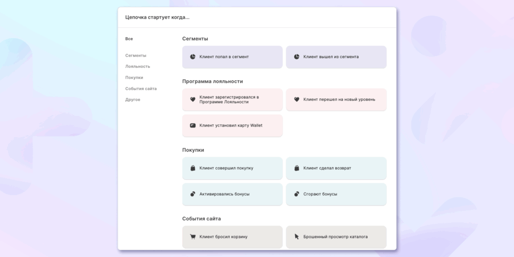 Триггер — это зафиксированное системой событие или состояние клиента в базе, которое инициирует цепочку коммуникаций. В качестве триггеров могут выступать: